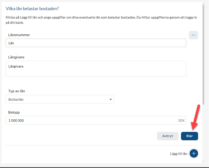 När säljaren har lagt till ett lån finns det nu en knapp för "Klar" så det är tydligare att det är sparat.