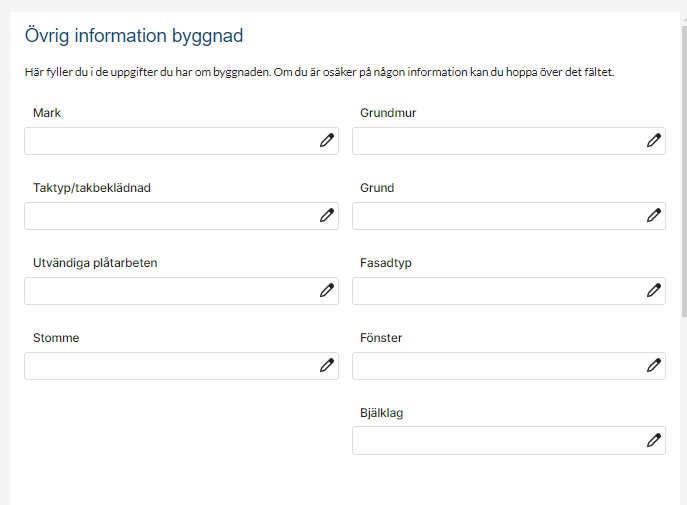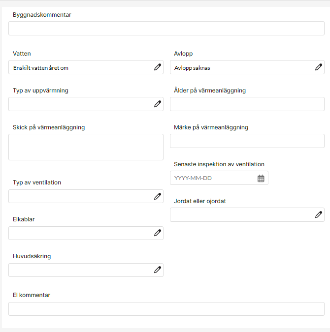 Nytt formulär - byggnadsinformation för småhus. I byggnadsinformation kan säljaren fylla i information om byggnadssätt, uppvärmning, ventilation och el.