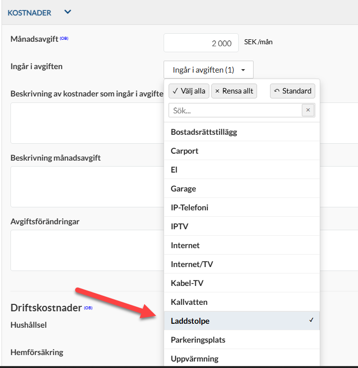 Efter önskemål från användare har vi nu lagt till "laddstolpe" som alternativ på vad som ingår i månadsavgiften.
