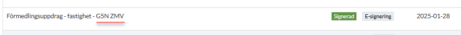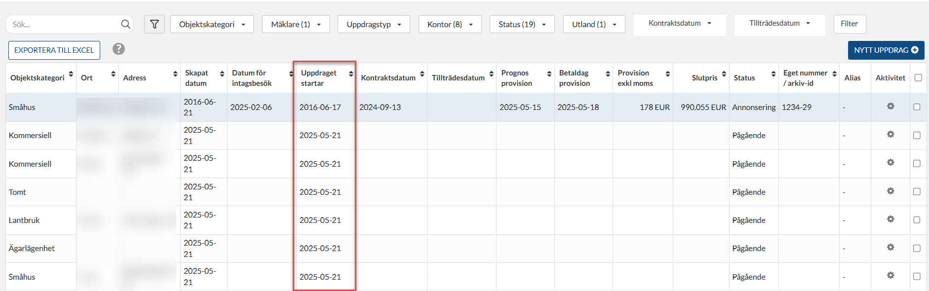 Kolumnen innehåller information om när uppdraget startade. Datumet som visas här styrs av de datum mäklaren sätter i fältet "uppdraget startar" under fliken Intag.
