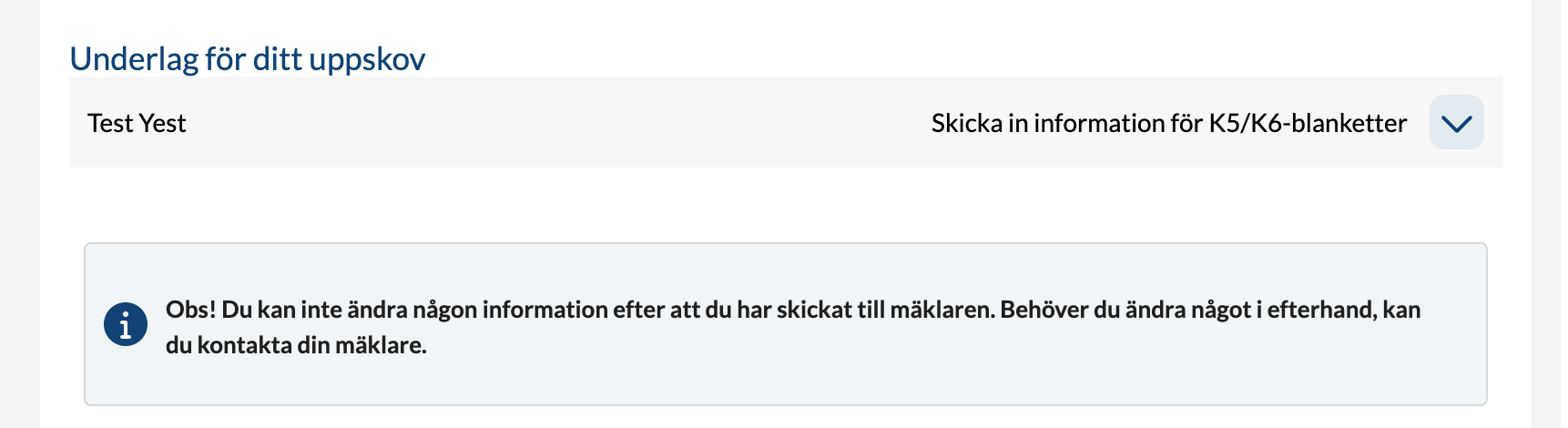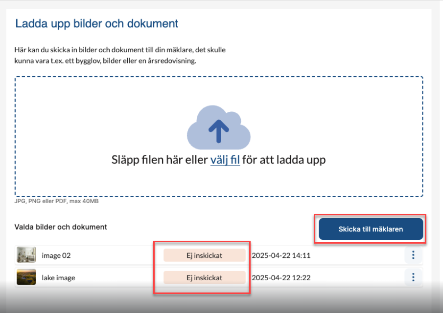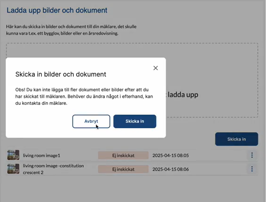 Nu finns möjligheten för en säljare att ladda upp dokument som ska skickas till mäklaren i flera omgångar utan att skicka in. Tidigare behövde användaren ladda upp allt direkt, och det kunde upplevas som otydligt att formuläret låser sig när man skickar in. Vi har därför ändrat texten på knappen, och det kommer även en varningstext när man klickar på "skicka till mäklaren" (se bild).