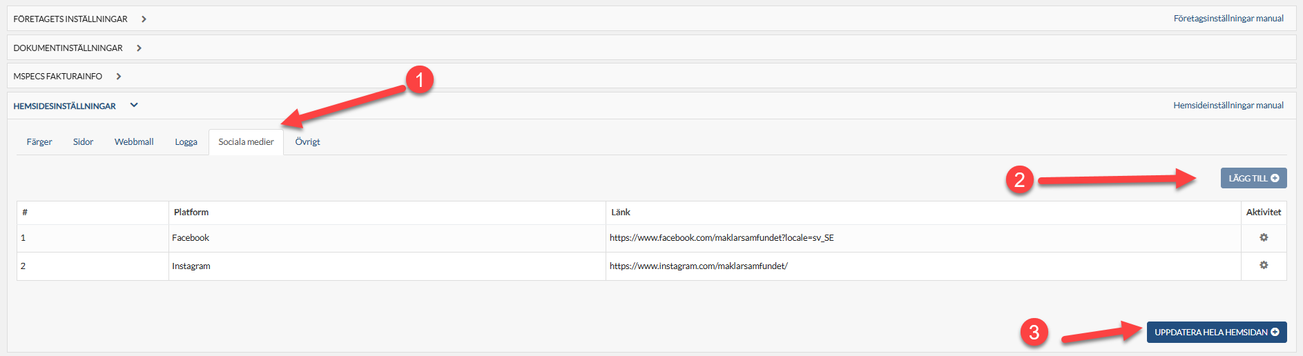 På hemsidan går det nu att länka till företagets sociala medier via ikoner för tex. Facebook och Instagram.