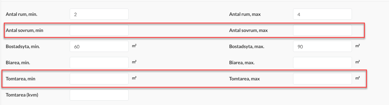 Det finns nu två nya fält i projektbeskrivningen, antal sovrum (min/max) samt tomtarea (min/max).