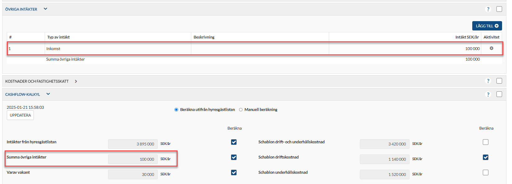 Nu kommer "övriga intäkter" med i cashflow kalkylen.